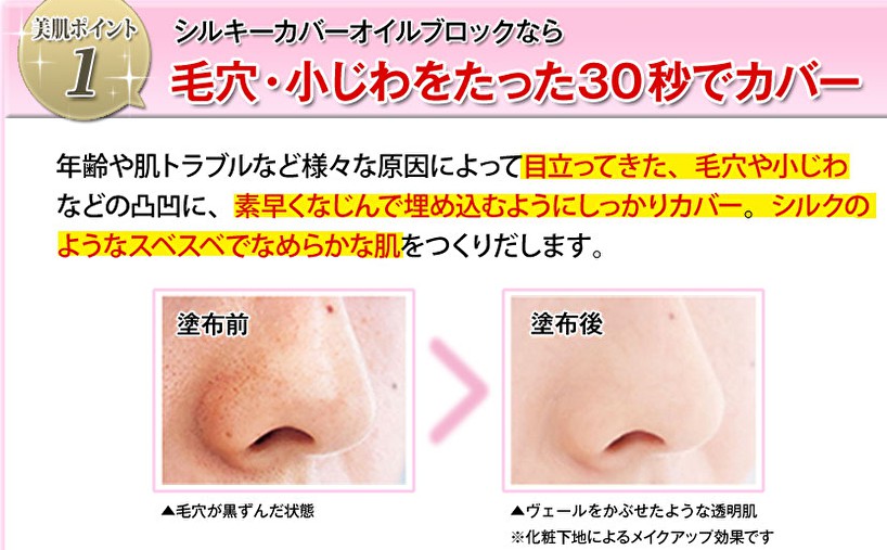 小じわを1日隠せる噂のアイテム 小じわを隠したい時の使えるアイテム 2013年06月12日 どんなに素晴らしいスキンケアクリームや美容液を使ってしわ取りを行えたとしてもそれが効果を得るには1月以上はどうしても掛かってしまいます。それはお肌の生まれ変わりや潤いを取り戻させる事ですので仕方が無い事だと思います。しかしそんな期間中でも出来ればしわやシミなどは隠しておきたい。。。。そう思うのは仕方が無い事だと思います。そこで今回ご紹介する『シルキーカバーオイルブロック』はそういった期間中に使えるステキなアイテムなのです。シミやしわなどを独自の微粒子パウダーによってしっかりとカバーして見た目では全くその存在を感じさせない程にしてしまうのです。さらにそれだけでは無く使用中はテカリや毛穴などの黒ずみなども目立たなくしてしまう他、細かい粒子のパウダー故に付着の効率も良くて化粧崩れなども起きないので安定して1日中その陶器のようなお肌をキープする事が出来ちゃうのです~♪しわなどの本格的なケアの途中の大切な時間をステキなお肌で過ごしたいという方におススメの『シルキーカバーオイルブロック』なのです。詳細はこちらより PR